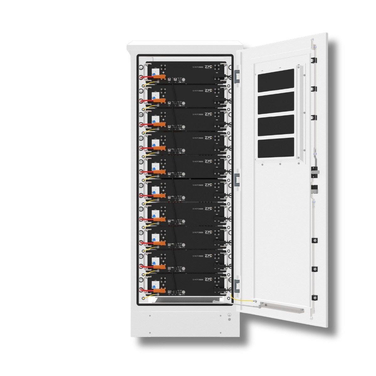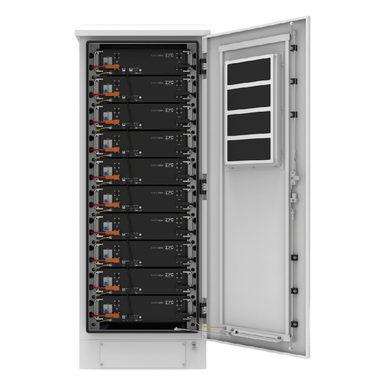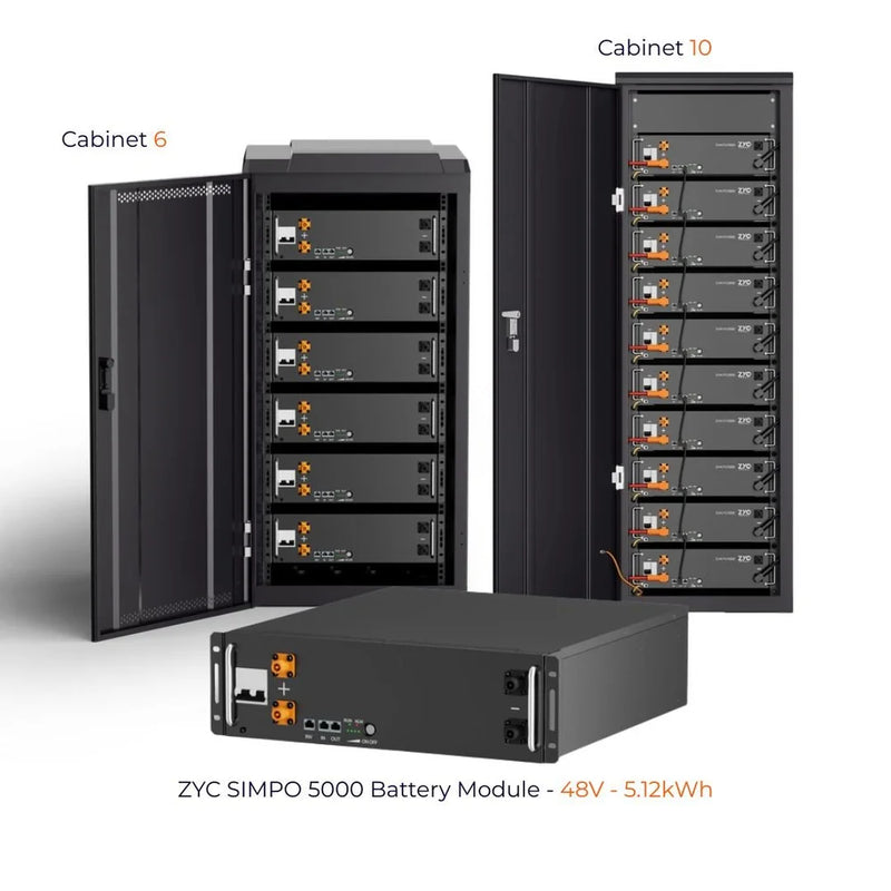 The ZYC SIMPO Cabinet10 is a pre-wired, plug-and-play enclosure engineered to house up to 10 SIMPO5000 battery modules (≈ 50 kWh) with factory-installed busbars and cables to simplify installation.